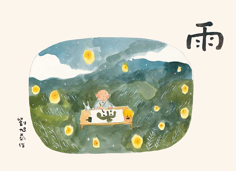 在眾聲喧嘩的世界裡,劉旭恭一直是個安靜的創作者,堅持著自己的步調,守護著單純的初心,用清澄明淨的直觀,述說著一個又一個溫暖的故事。若說「文如其人」,那麼劉旭恭就是書中每日習字的小和尚,那一張張誠心誠意寫出的「雨」字,猶如作者多年來自我修鍊的創作歷程。