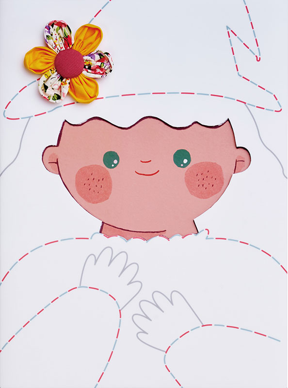 The cover of this picture book has a cut-out that lets you peek at the main character’s face! Around it, there are little drawings of sewing tools and threads, making it look fun and handmade. Before you even start reading, you can guess what the character looks like and what they like to do, which makes you curious and excited to open the book and see the story inside.
