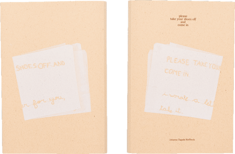 Please take your shoes off and come in is an autobiographical photobook by Johanna Tagada Hoffbeck. The book design itself carries emotions. The binding is composed of soft paper, low-saturation ink and an exposed spine stitched in grass-green, forming an edged curve. The warm, smooth quality of both the cover and textblock embodies the inviting tone of the title, “Please take your shoes off and come in.” There is no distinct border or a loud layout. Instead, there is a tender and modest minimalism that leaves blocks of blank space. Turning the pages feels like stepping into the artist’s home, strolling slowly through her garden amid light and shadow. The images capture details of daily life in soft focus and closeup shots, while the design strengthens these silent moments with a tranquil rhythm. The overall materiality becomes an extension of the content: soft and intimate with a strong sense of time. The book design does not serve the images but breathes with them. The whole work whispers like a poem—inviting the readers into the artist’s serene and secret world with physical touch.